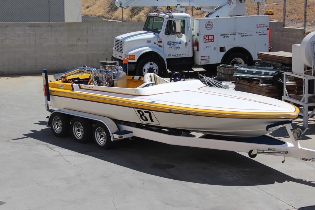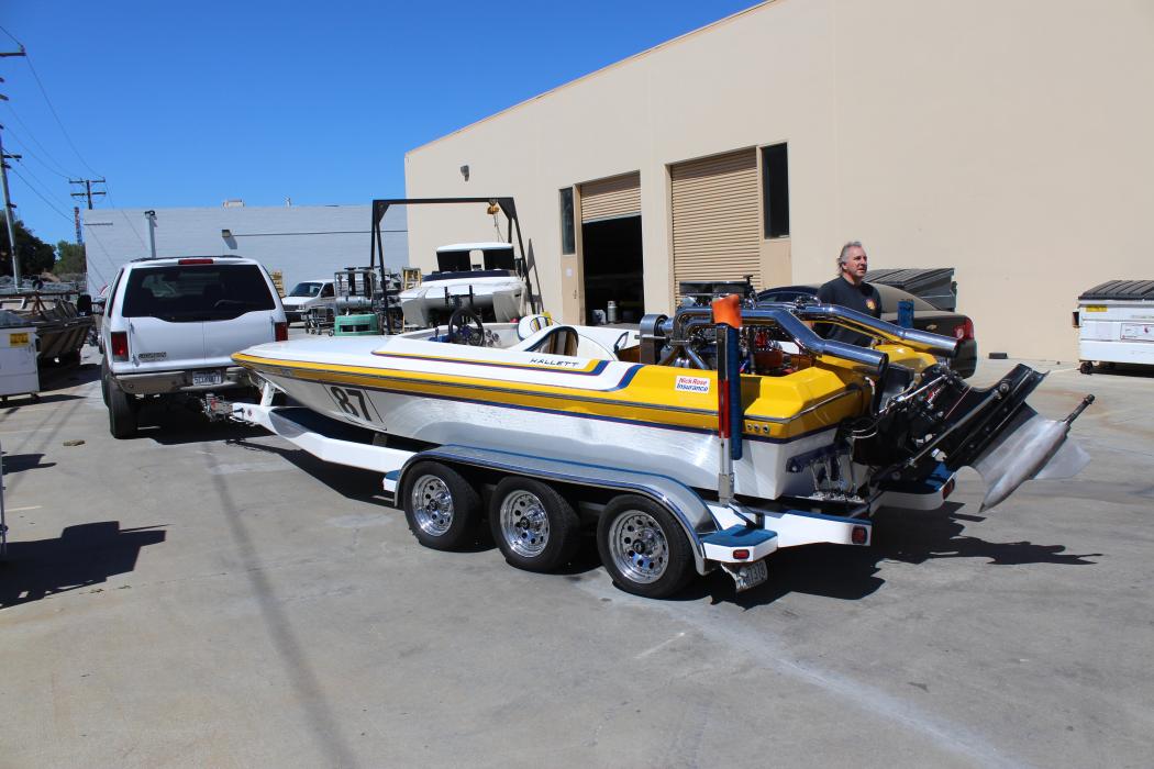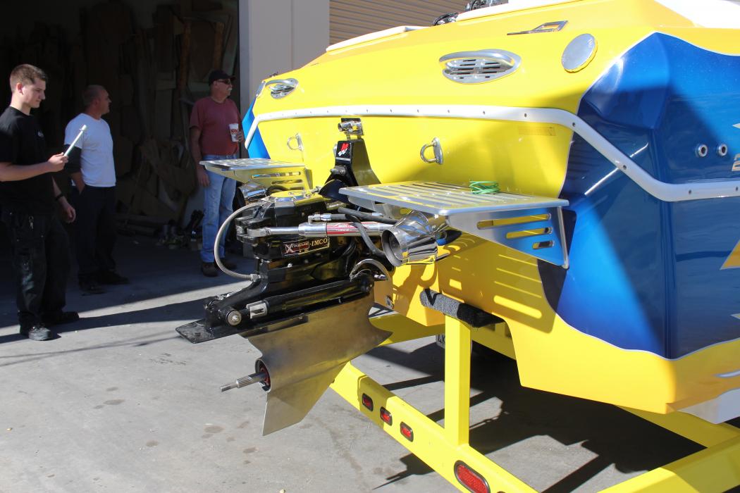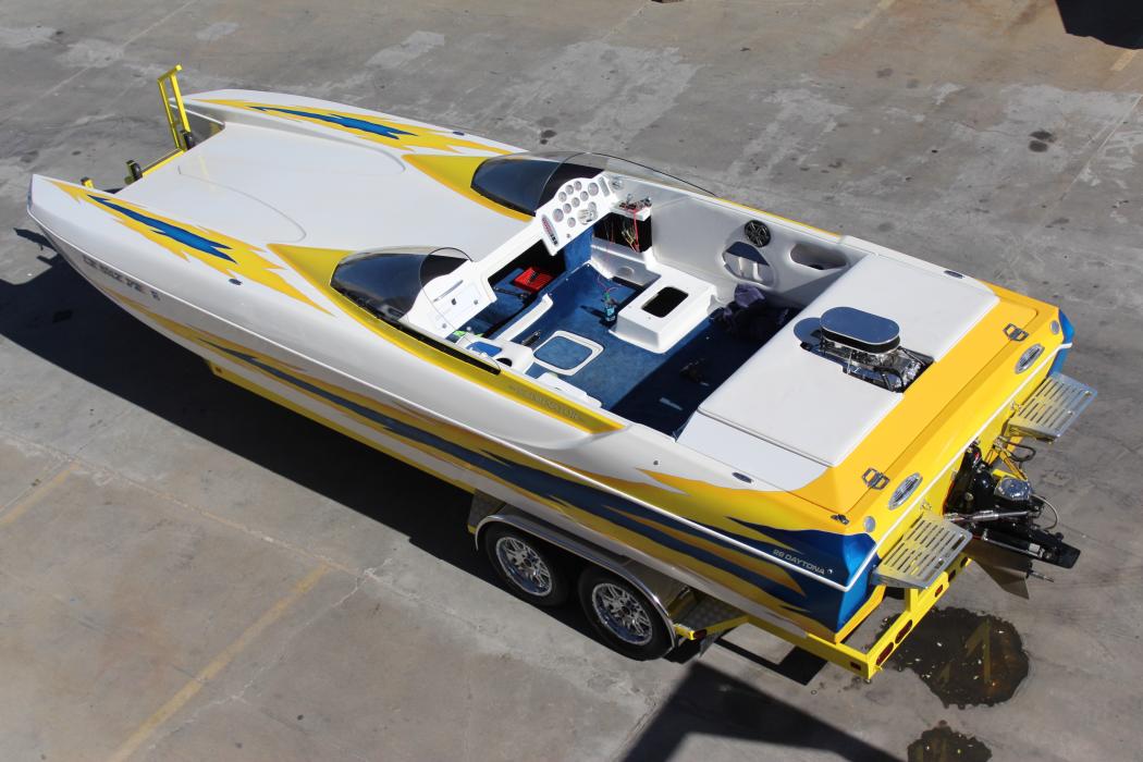 Eddie Billett's 26' Daytona w/ 1100 hp motor and max machine drive, 588 BBC with a 14:71 blower shop blower. NRI left before the interior was installed...check out his boat at the Rootz EFI booth.