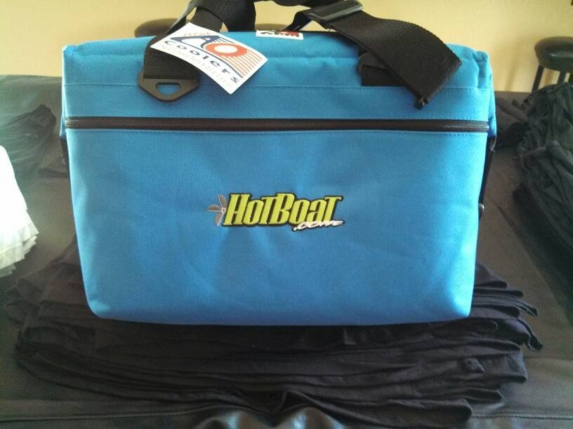We were cruising into pirates cove Saturday morning when I heard some one yell at me, I look over at the boat next to us and this guy was pointing at his hotboat hat, they must have seen my hotboat tank... Not to be out done pulled out my koozie and waved it at them lol then one of the girls starts waving her hotboat shirt on the air... We didn't wanna loose this battle so I had my buddy hold up our ice chest.. Lol I think we won that one! They were in a very colorful cat, maybe 28 foot.