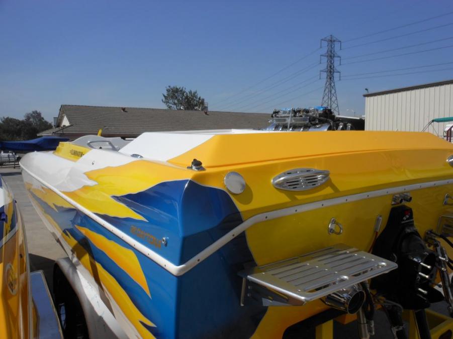 Eddie and Shannon’s maiden voyage in Lake Havasu at Desert Storm was a success. The boat ran an easy 112 mph at about 4000 rpm. He said, “The acceleration was incredible”. The final day of Desert Storm the boat ran 120 mph. Hotboat was able to see the boat up close and personal at Desert Storm and I have to say all the people that worked to get the boat completed to what it is today, you are all top-notch in your industries. The boat looked magnificent and ran like a champ.