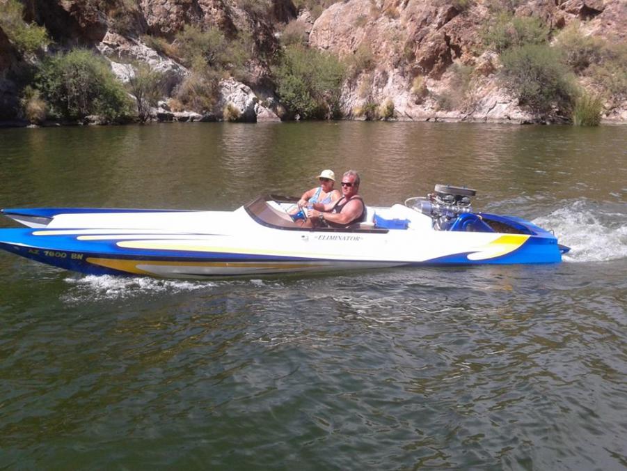 My 04 21' Eliminator Daytona. My wife and flew down to eliminator to design the gel and discuss options. In May of 04, the boat was ready. I had Tom Papp's shop install the polished Aggressor Jet and Intake. The boat rides on a 02 Extreme trailer. I picked the boat up and got it home on Mother's day, 04. My wife claims the boat as her Mother's day present for that year. When I got the boat home, it had the interior, jet and motor plates installed.