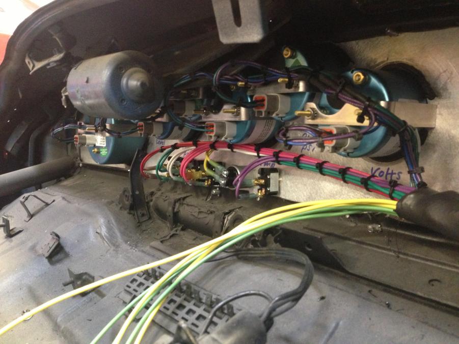 The front of the car is done. Just neet to wire the fuse panel and engine. The harness is all covered in wire net, with every connection and splice covered in heat shrink tube. No split loom and electrical tape here. It takes much longer to do it this way and if you forget a wire you have to start all over. It is totally worth it though. This wire harness will out last this car.