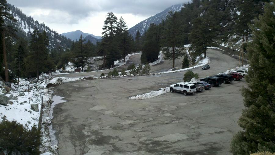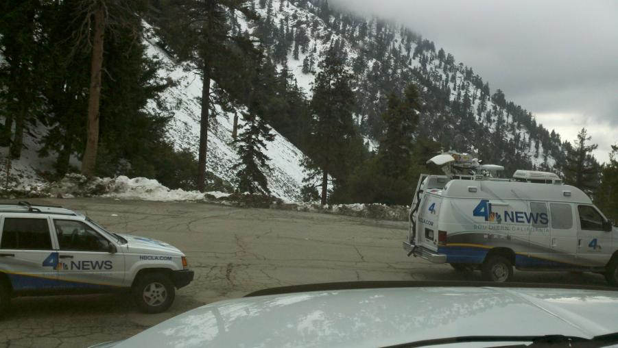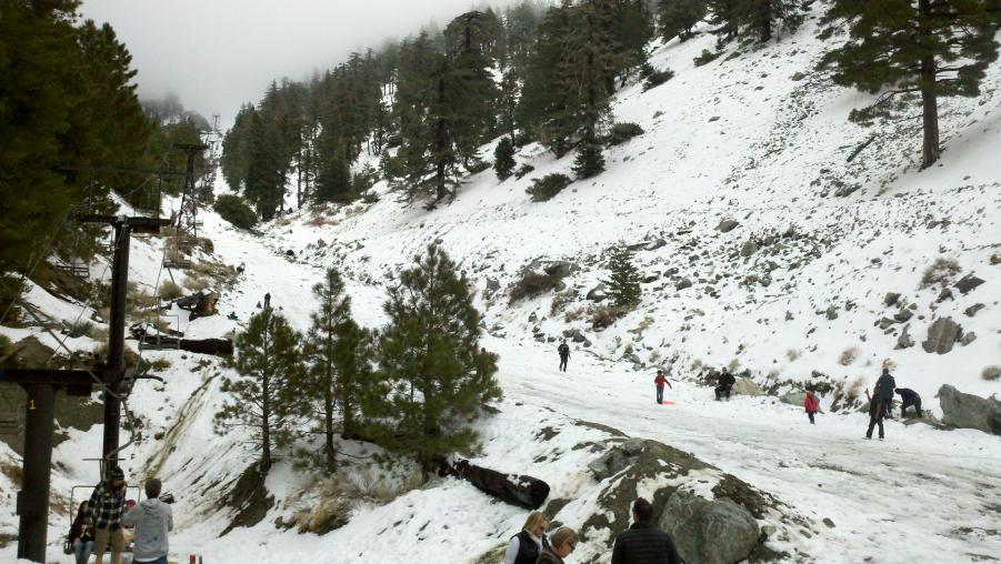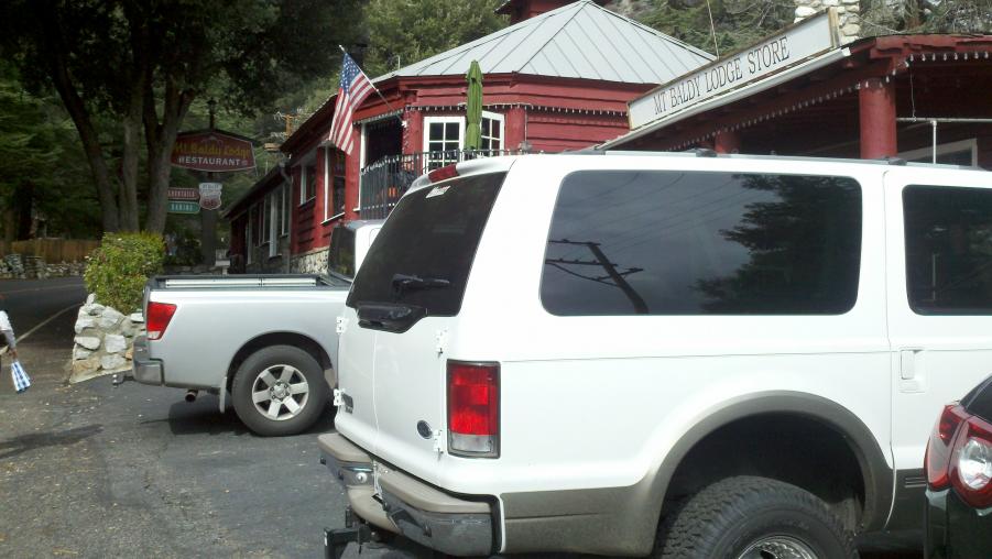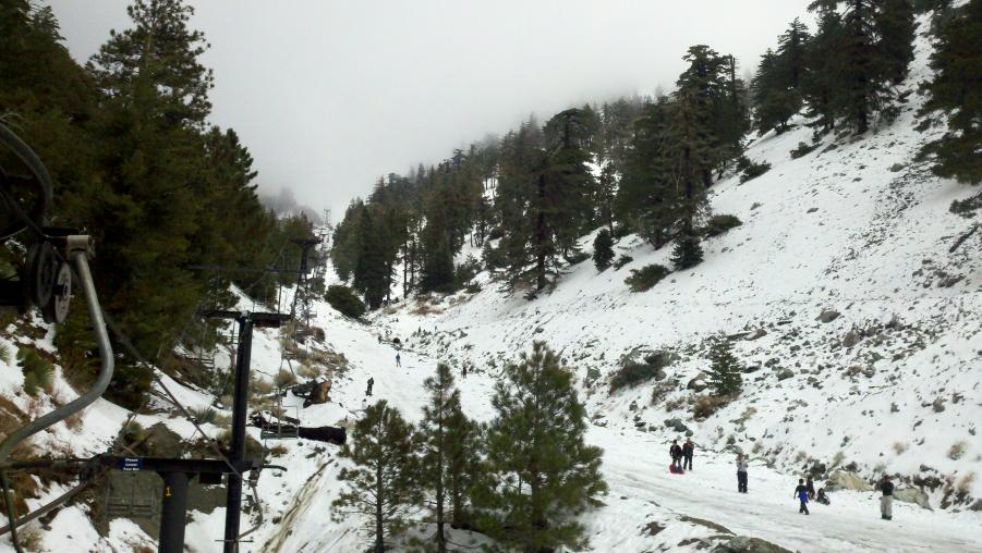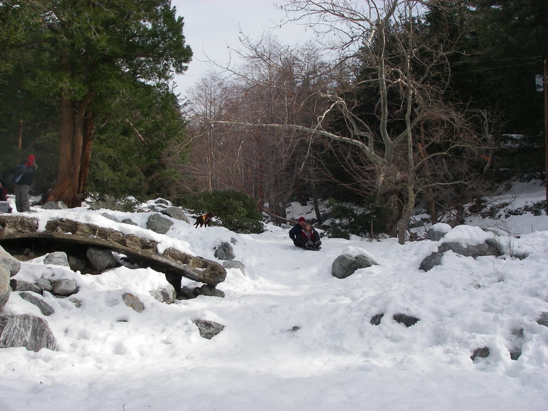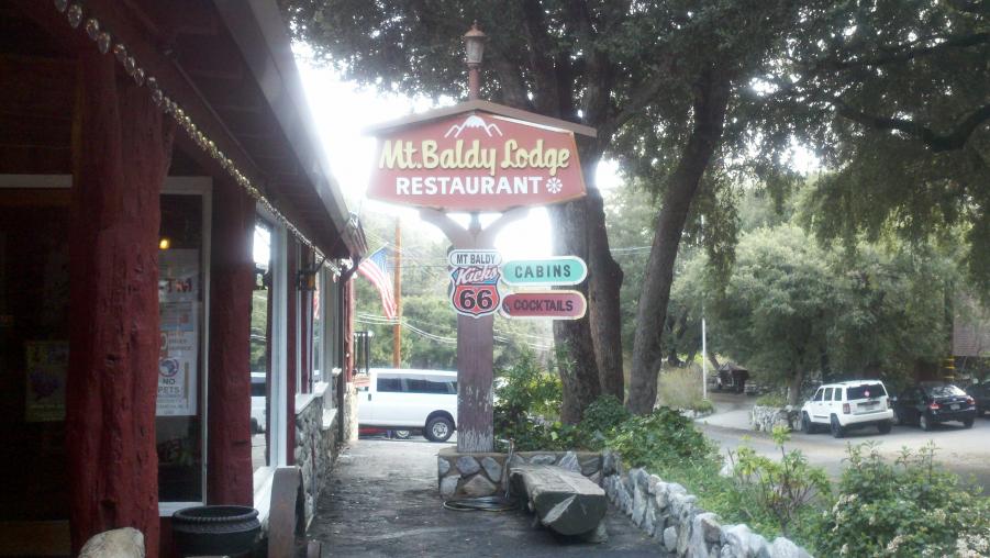 MMA and I went to check out Mt. Baldy and had lunch at the Mt. Baldy Lodge today. Mt. Baldy didn't really get much snow this last weekend but there were some kids making the best of it sledding down the ski area. NBC was there doing a report about the lack of snow this year and how it was affecting the local businesses. There was also this big ass dog out in front of the Lodge that was mistaken for a bear by a little girl.:biggrin: