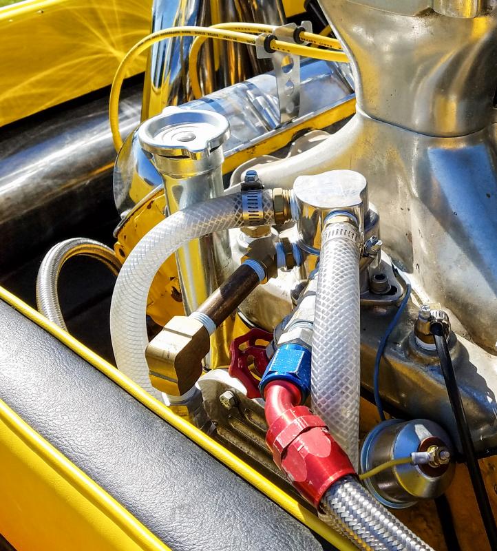 Notice the two vinyl/reinforced tubes coming up either side. That's my "water in" from the pump. There is a valve in the back at the pump, which I opened. When I was sitting and idling, I could watch water "bouncing" up and down in those intake lines, but never quite making it all the way up to the inlet. When I popped the throttle I could see the water column rise up, so I decided to try a test run. When I got on the throttle (Oh, my - it was orgasmic) the water sure seemed to start flowing... I could see heavy vapor coming out of the Headers and my water pressure gauge started registering and the engine temp was around 215-220. However, when I got back off the throttle, I don't think the water was flowing and the engine temp quickly climed back up towards 240. Is there some "balancing act" I have to perform with my water?