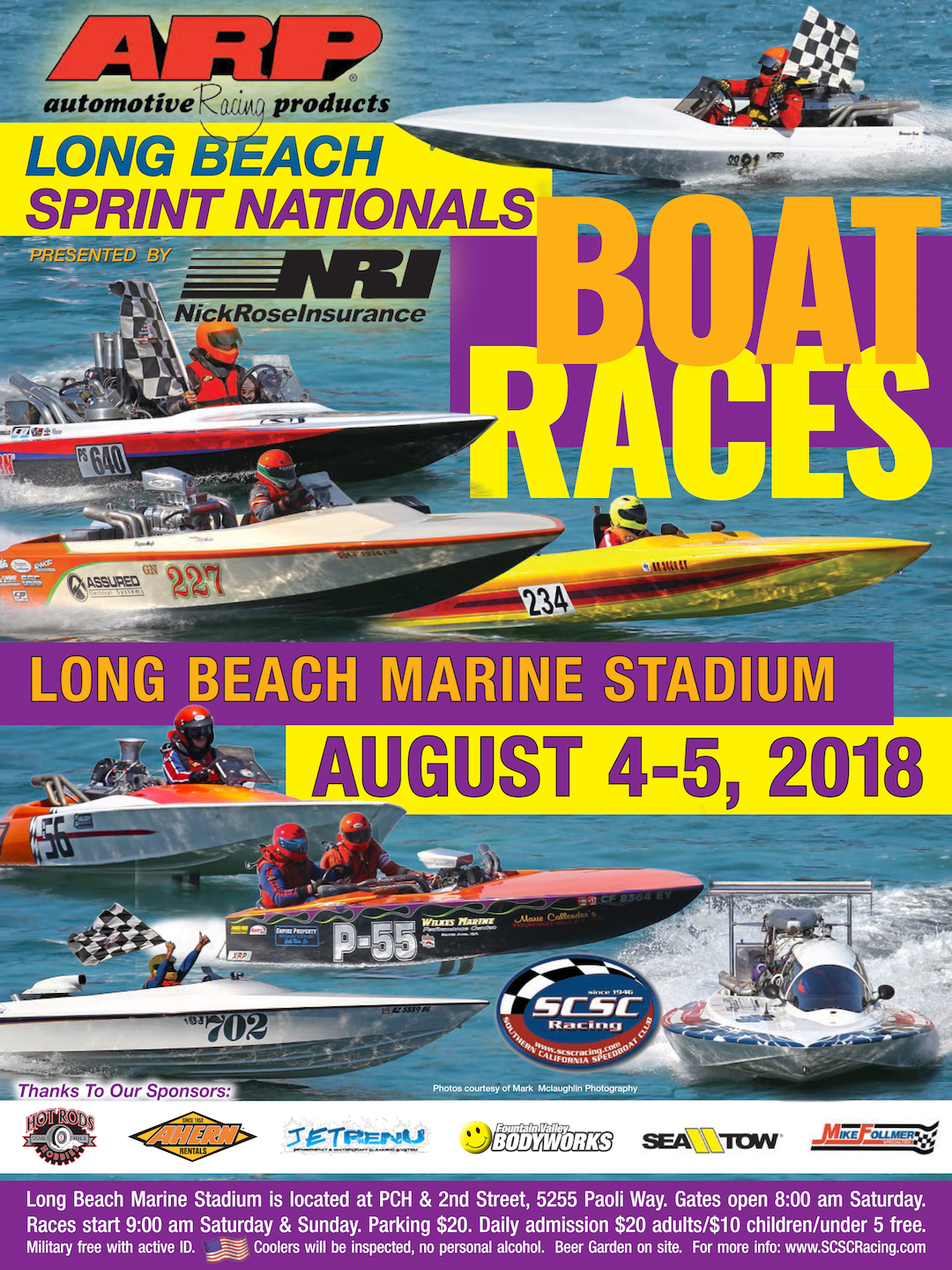 Starting in 1946, the Southern California Speedboat Club (SCSC) has been conducting races at the “birthplace” of powerboat racing on the West Coast, Long Beach Marine Stadium. Once a year, in August, the Southern California Speedboat Club stages the annual ARP Long Beach Sprint National Championships Presented by Nick Rose Insurance for Sprint Boat racing featuring 10 classes of the fastest Flatbottom, V-Bottom & Jet Boats from around the nation competing for bragging rights, titles and their share of prize money.