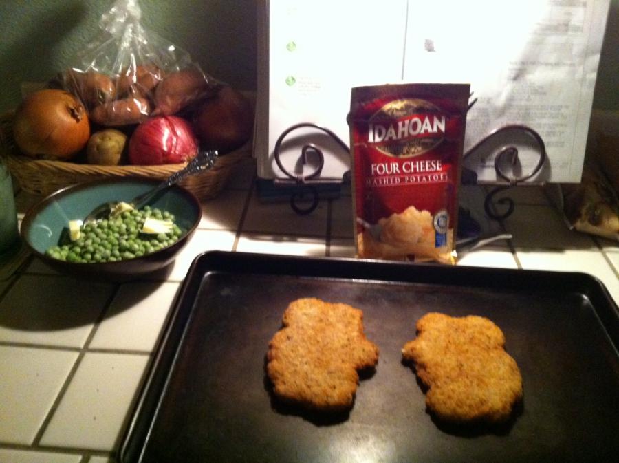 Sam's club frozen country fried steak, frozen peas and powdered potatoes. Oh, and gravy.