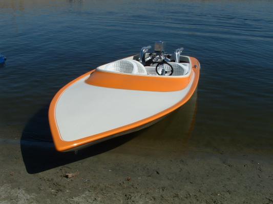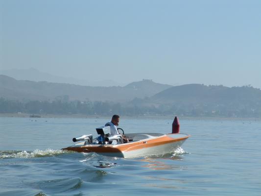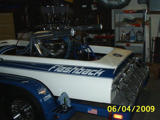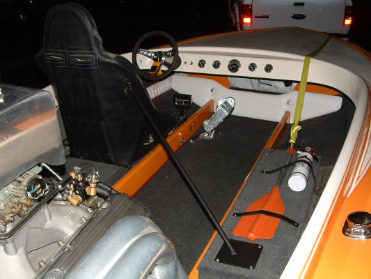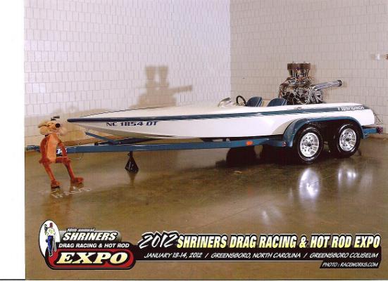 1974 HONDO FLAT BOTTOM, powered by MOPAR, it is a 440 bored 60 over, it has 15% gears with a 11 1/4 by 15 prop, it has 2 750 holley's, the driver pictured in the boat is my grandson, Lincoln, he loves anything loud and fast, everytime he rides in the boat, he wants to know where the rooster tail is, I tell him we don't have one and he always says he is going to get us one. I am a member of a club called CLASSIC HOTBOATS, if any of you get a chance, come and hang out with us, have a good one!