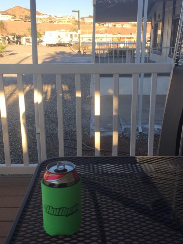 Beer, boat, coozie, river, chair.