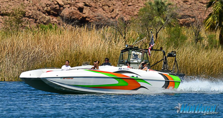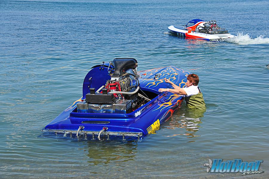 That Cyclone is going to be hard to contend with for the smaller/lighter hulls in the rough water... It looked like Tom had the HP/weight advantage to pull him down the straits pretty easily... Mr Mason said that THAT particular Cyclone is considerably lighter than his other hull that runs the Catalina ski race, it has a traditional jet set up and does NOT run the Z-drive into the JET like his OTHER Cyclone with twin hairdryers on the BIGGER Hemi ford (catalina ski boat)...