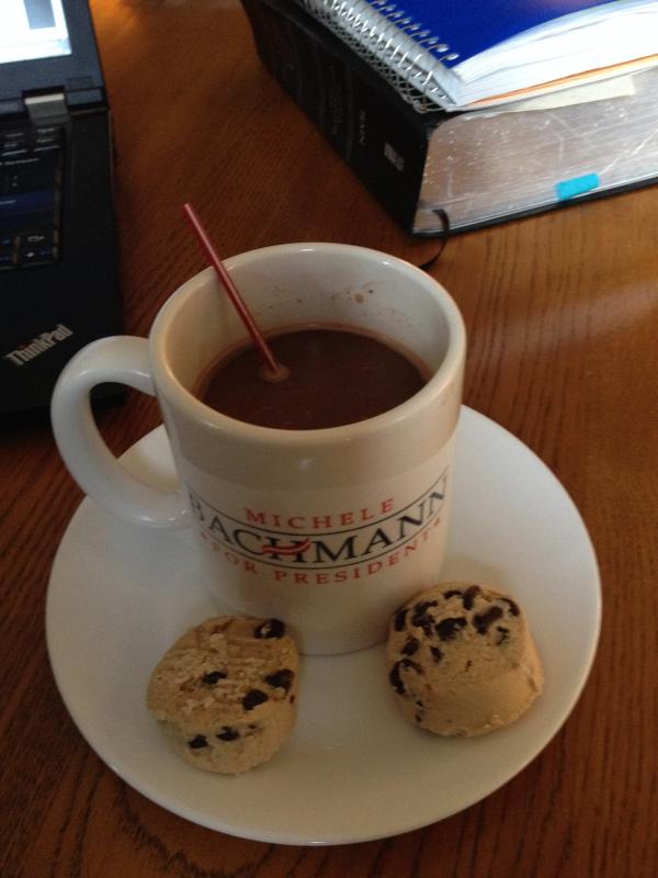 Mochachino (one scoop swiss miss in strong smooth coffee), Otis Spunkmeyer frozen chocolate chip cookie dough...