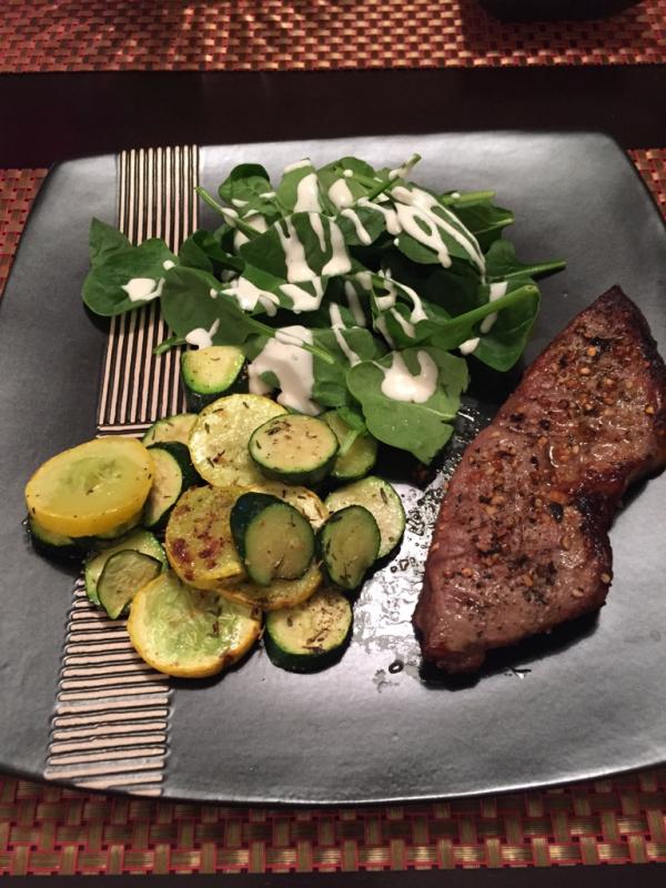 Sirloin, thyme zucini and baby spinach for me, potato crusted cod for her [emoji39]