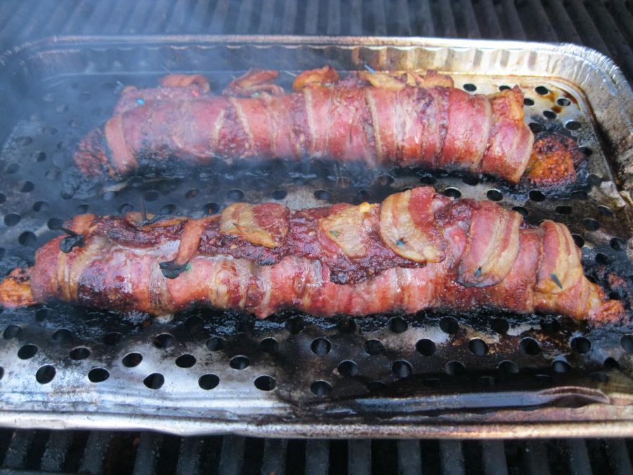 Not bad really. Seasoned ground beef w/chopped onions and garlic into a meatloaf then rolled up with over a cube of cheese, wrapped in bacon.