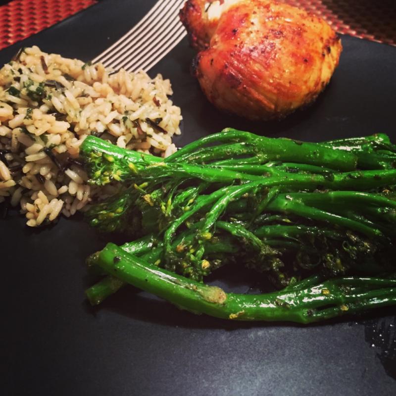 Oven grilled seasoned chicken, sautéed brocolini with a little flavorgod everything spice and rice a roni. [emoji39]