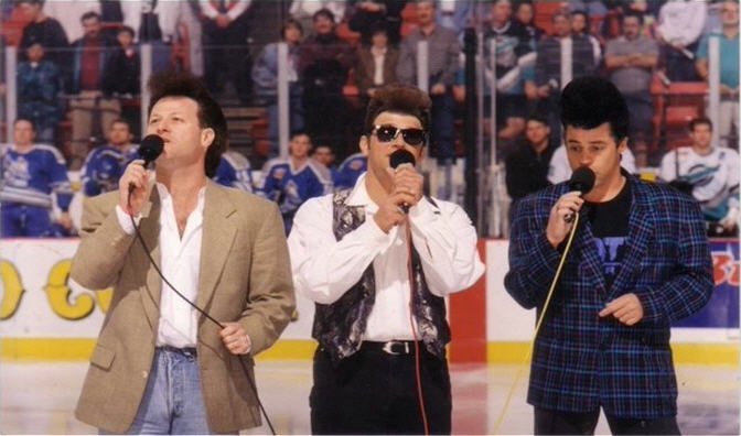 As long as we're waltzing down Memory Lane, here's a shot of me ( on the right ), and the guys, standing on the friggin' ice, singing the National Anthem to open a Anaheim Ducks hockey play-off game..same hair, just pomped.Attachment 64808