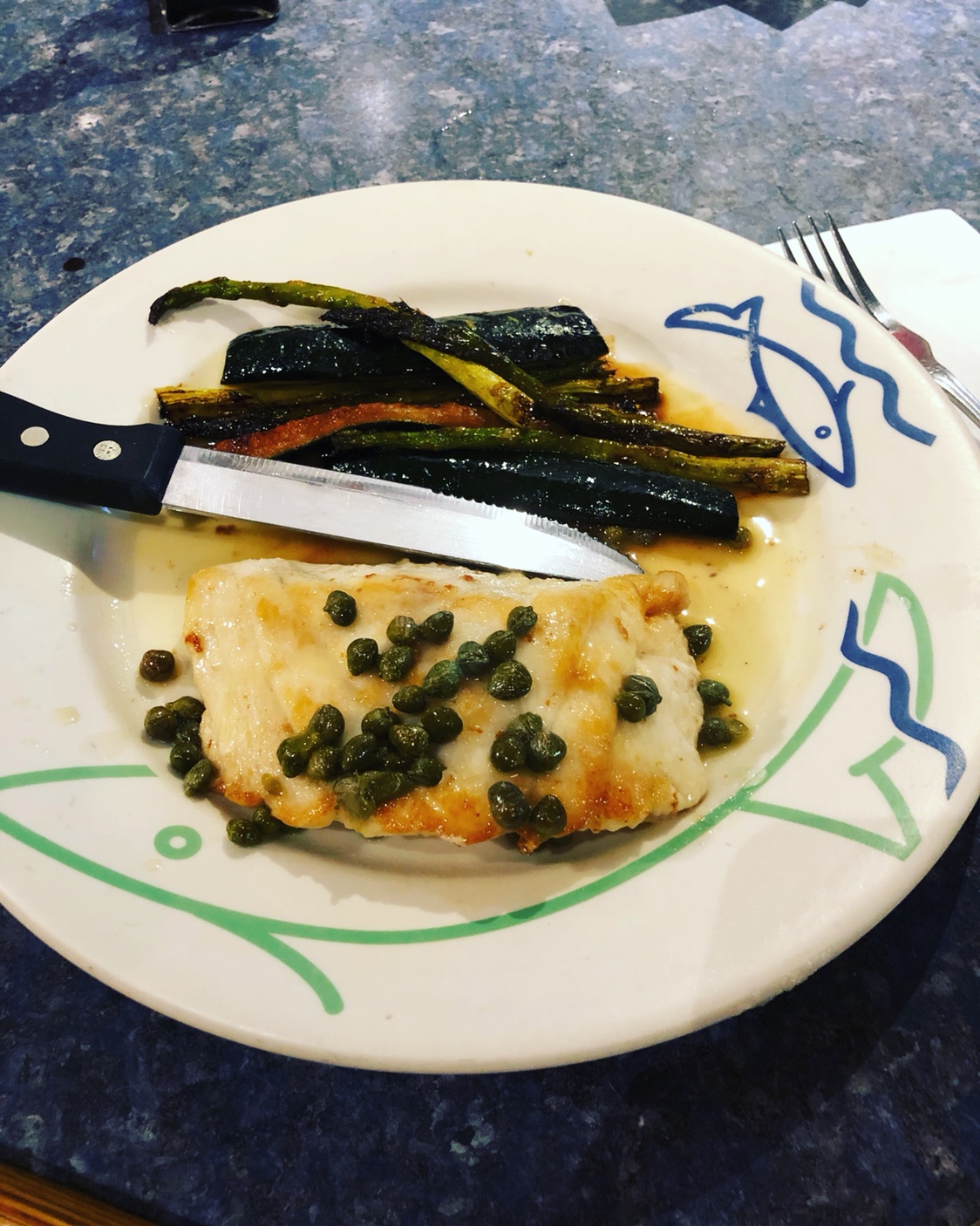 Wow managed to find this old thread and dust it off. Sea bass in lemon caper sauce with a little zucchini and asparagus. Simple yet delicious
