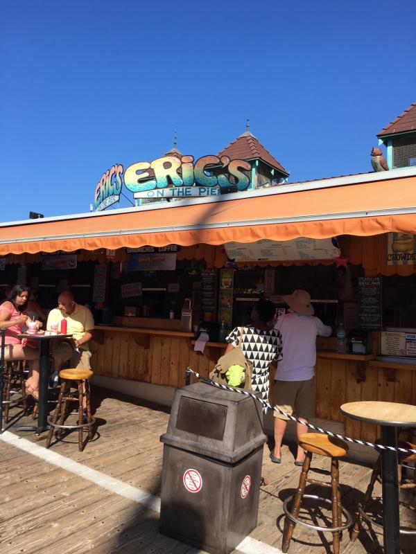 I remember being a kid getting burgers and fries at the green building on the pier....If I remember correctly, it is just like a walk up bar counter where you can eat.....Cant remember the name though....