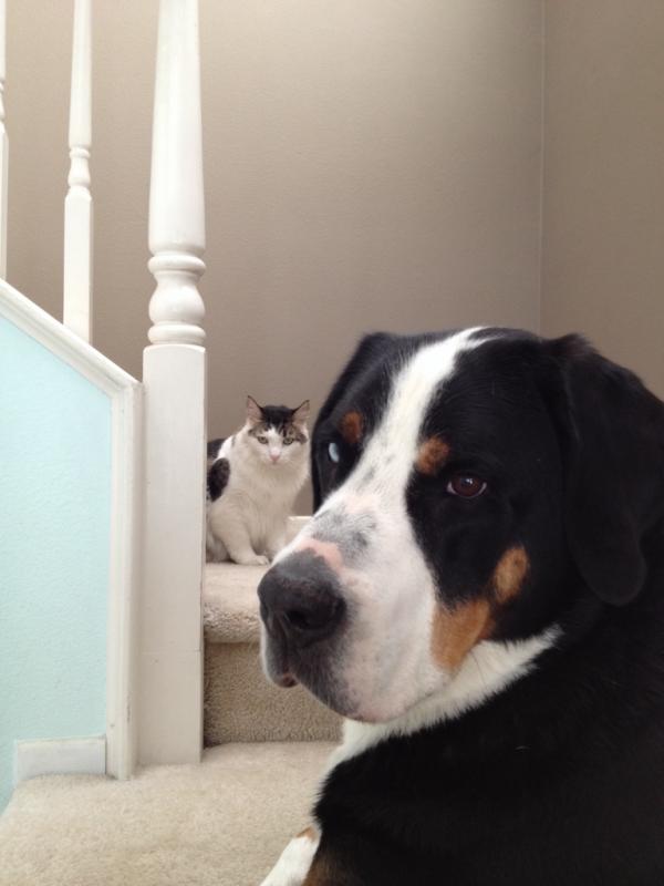 K9 feline standoff on the stairs.