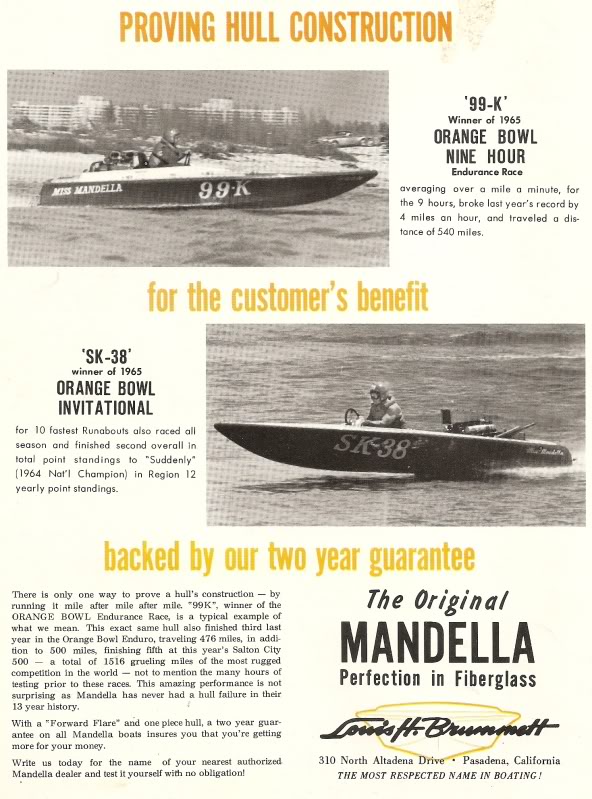 Prior to the "professional" association, the marathon guy were pretty much a rag tag, run what ya brung group with no real boat rules. The only real limitation was the Salton Sea 500 which didn't allow supercharging. Unlimited fit them pretty good really. There simply was no limits. Aircraft, tank, multi engines, you name it, it was all OK. Until after the 1965 Salton Sea 500, and then they called out restrictions calling for automotive engines.