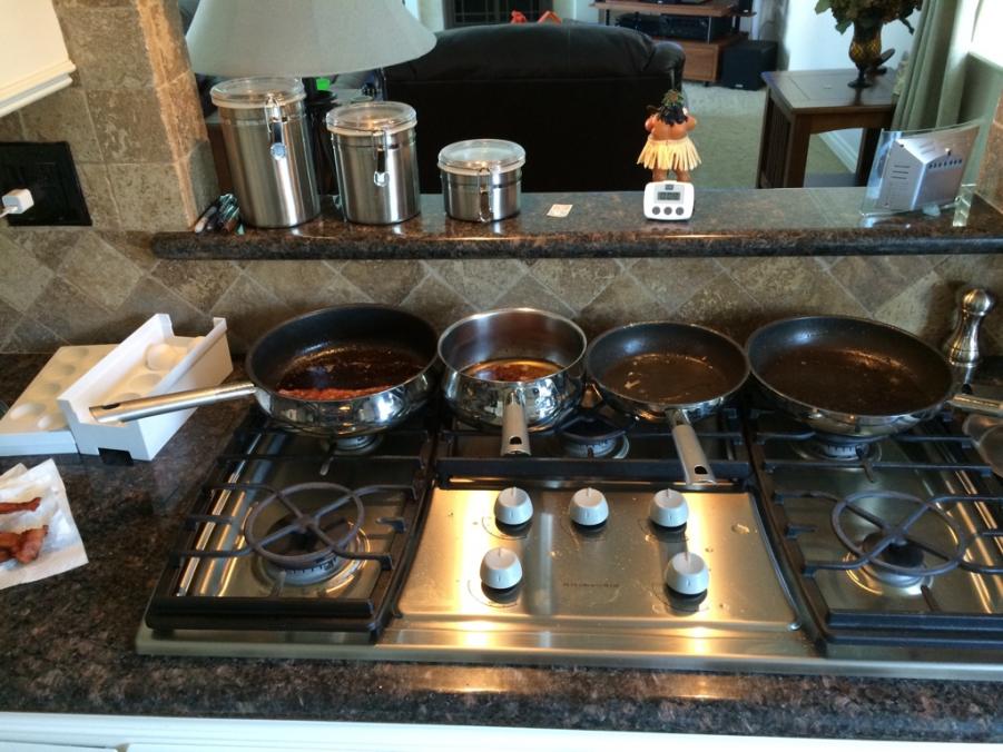 They're frying bacon right now. Translation=giant mess for me to clean up shortly.