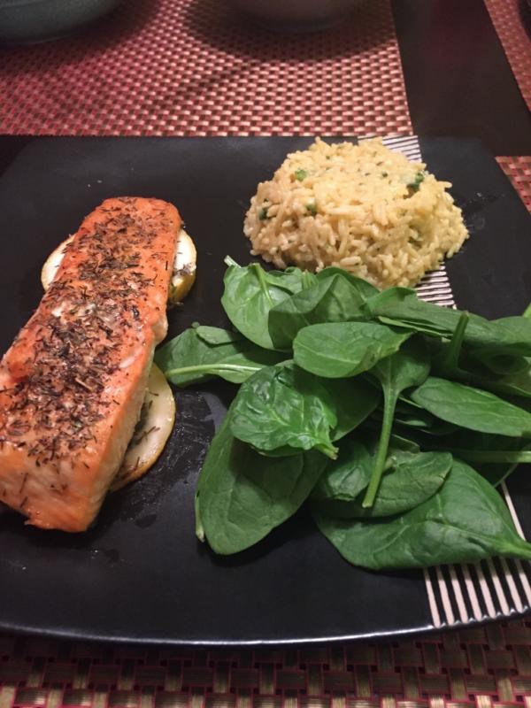 Dinner. Lemon thyme salmon, broccoli cheese risotto and spinach salad yum