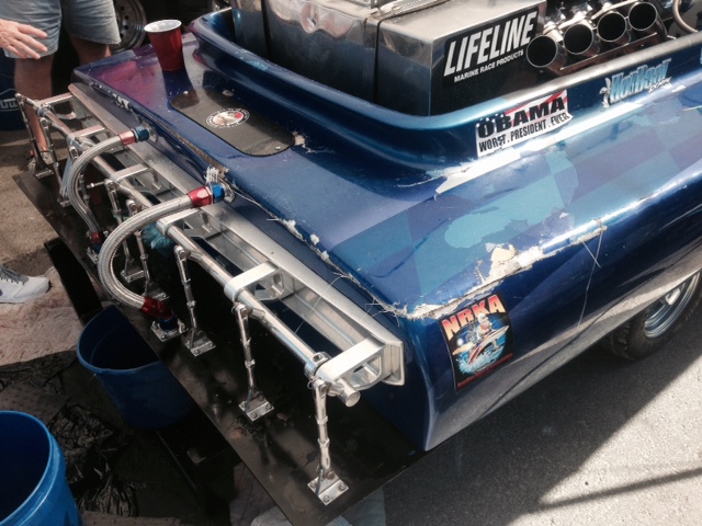 I think is was a number of things, I probably shouldn't have run that hard with the new hydraulic system not being used to it, but the boat took a good set so I just rolled into it, my foot was off the down and I rolled off the throttle early to take it easy into the turn and I hit the rollers, with the hydraulic so easy to push I might have bounced my foot off of it when I hit the wakes and slammed the nose but I don't know, I feel bad for Pat and the entire Eason family, they put a lot of work into that set up and it worked great, and my dad who built a great engine and I put it in the salt water again. I wish we could have ran better.