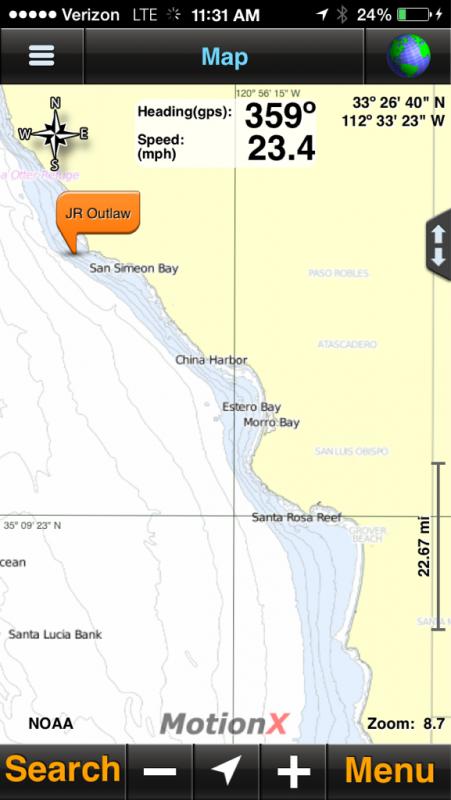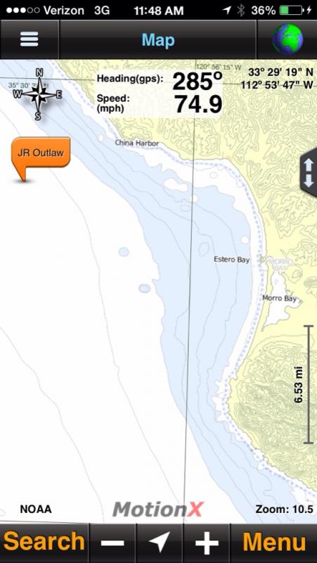 Ok, I'll explain how it works: They (Team Outlaw) will establish both records under the Marani Trophy (SF to Los Angeles) and The Marani Bell (SF to Long Beach) if they complete both finish points. The current record (Bob Nordskog Powerboat Magazine Trophy) is held by Nigel Hook, Dan Macnamara, Johnny Lindstrom & Rique Ford his team in 48' Scarab this record was set in 6 hours and 43 minutes back in 2003. Team Outlaw is a Cat (50' Outerlimits) with twin gas powered big blocks so since Nigel's previous record was a V hull they are considered separate records. Hopefully all good - coming up on Pismo Beach!! Getting there!!