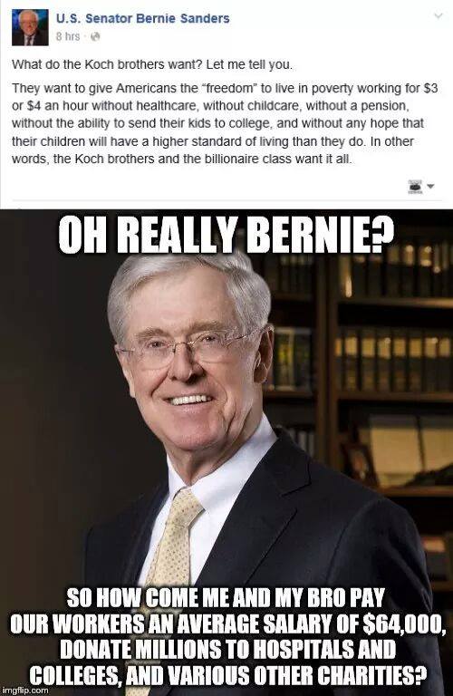 You poor Bernie supporters are following a blind sheep. He actually believes the Koch brothers are what is wrong with America when, in fact they are the employers who are what is RIGHT for America.
