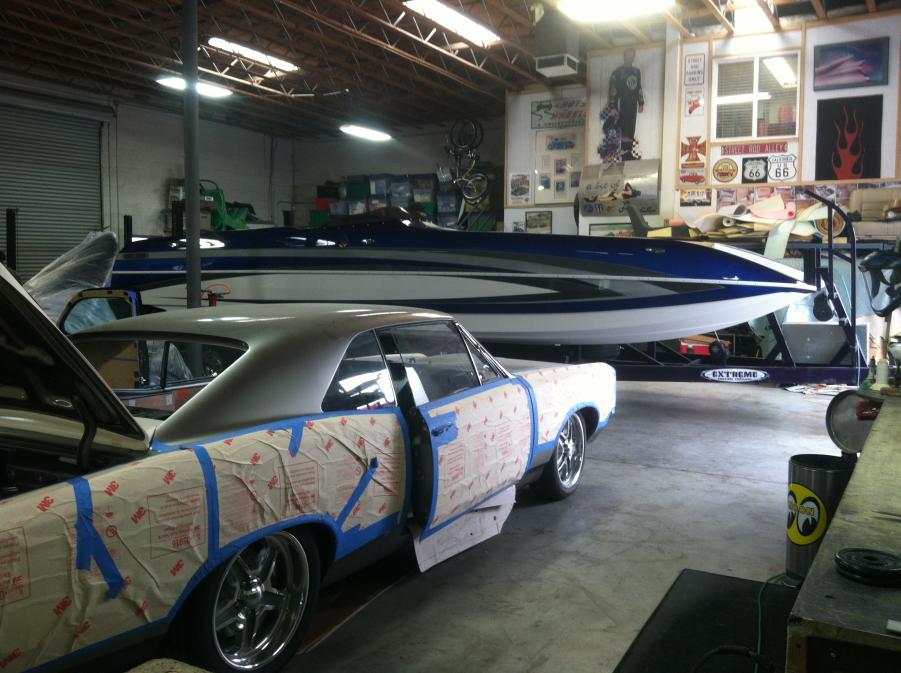 Here is number two of three that we are building right now. Here we have everything taped up and spraying the bottom portion of the mold. The deck is still being taped up as I made a couple last minute changes. I am really excited to see this one come out of the mold. You can get an idea of how the graphics look once the tape lines were removed after the base coat was applied. Enjoy.