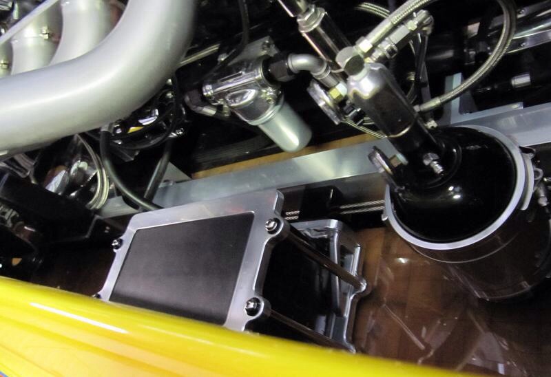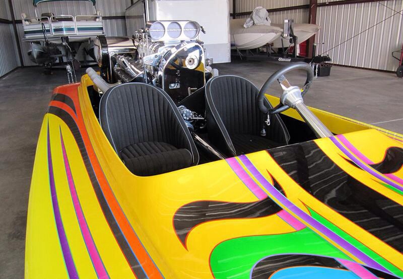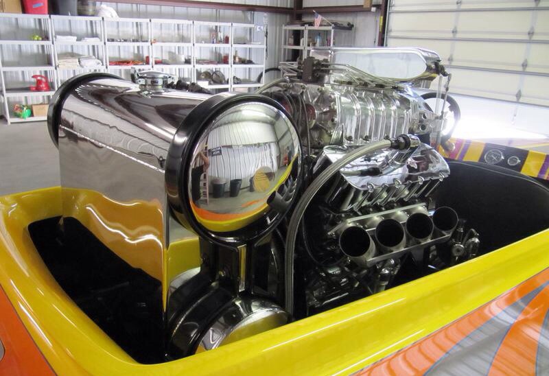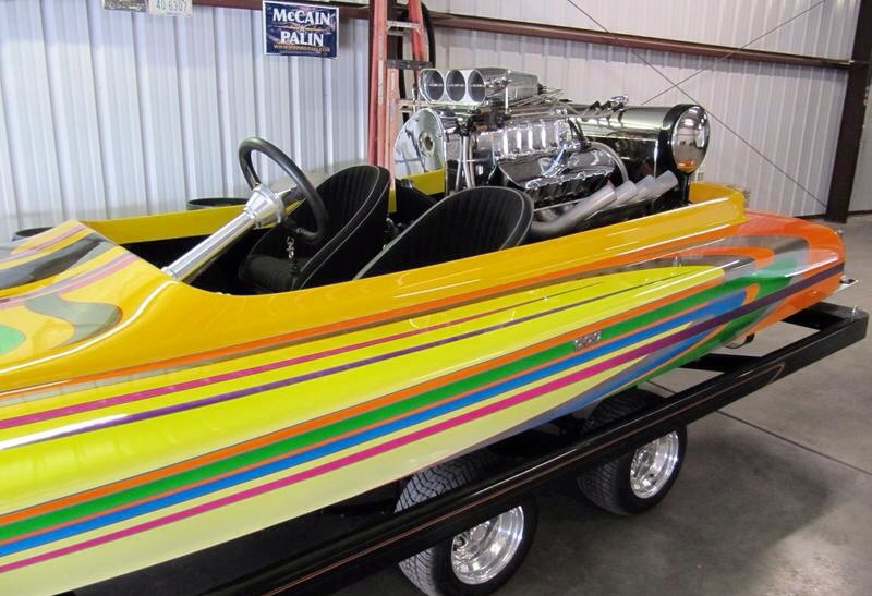 Biesmeyer k-Boat, paint by Billy B, rigged by Dave Rakin, 468 Chevy gas motor, 871 Moonyham blower, Enderle injection, air-assist down pedal Casale v-drive, dolly trailer.