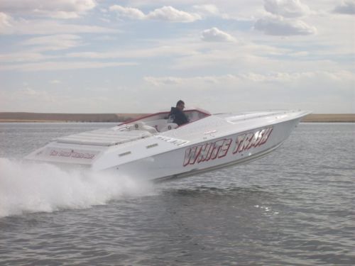 1997 fountain lightning 35 foot *FAST!* Whipple charged, intercooled, fuel injected, bored 30 over 502s fresh off break in oil. Very turnkey motors with rev limits at 5200 RPM. New bravo one drives with big shaft. Two sets of 4 blade props. Drives have 13 inch standoff boxes with latham external steering and silent choice pipes. Interior has hydraulic bolster seats, a new $8000 stereo with 3 new deep cell batteries, 1 year old upholstery, race bimini top and aluminum race windshield.